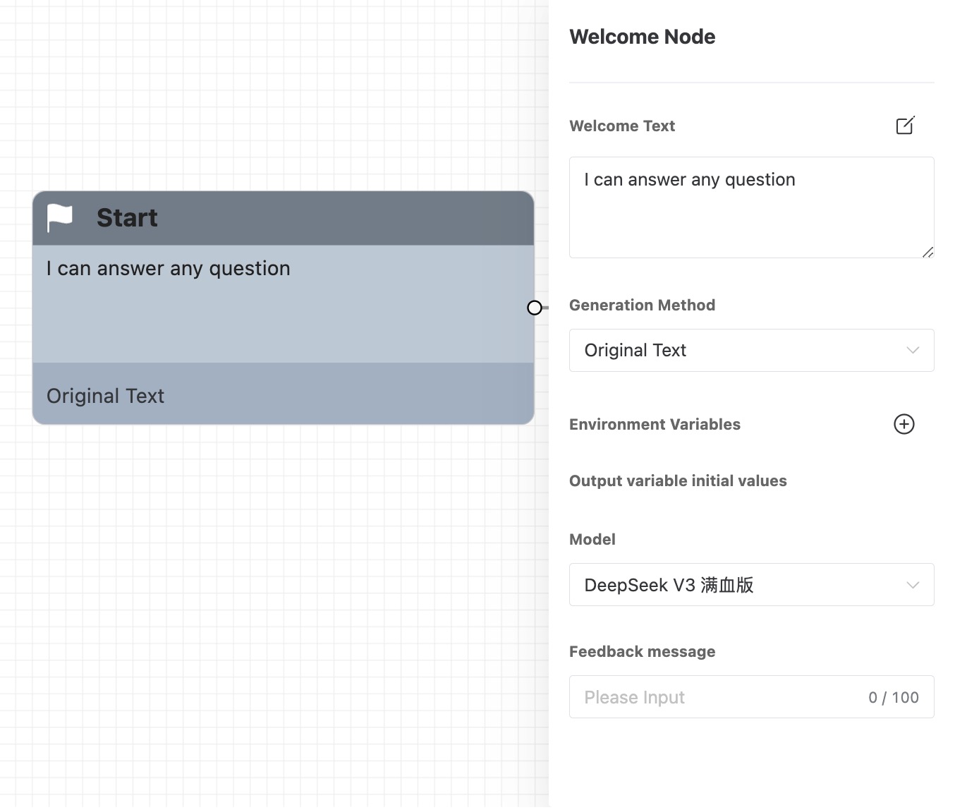 The start node is automatically added by the platform when creating each intelligent agent and cannot be deleted.